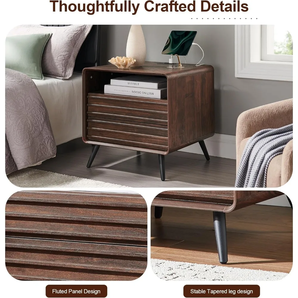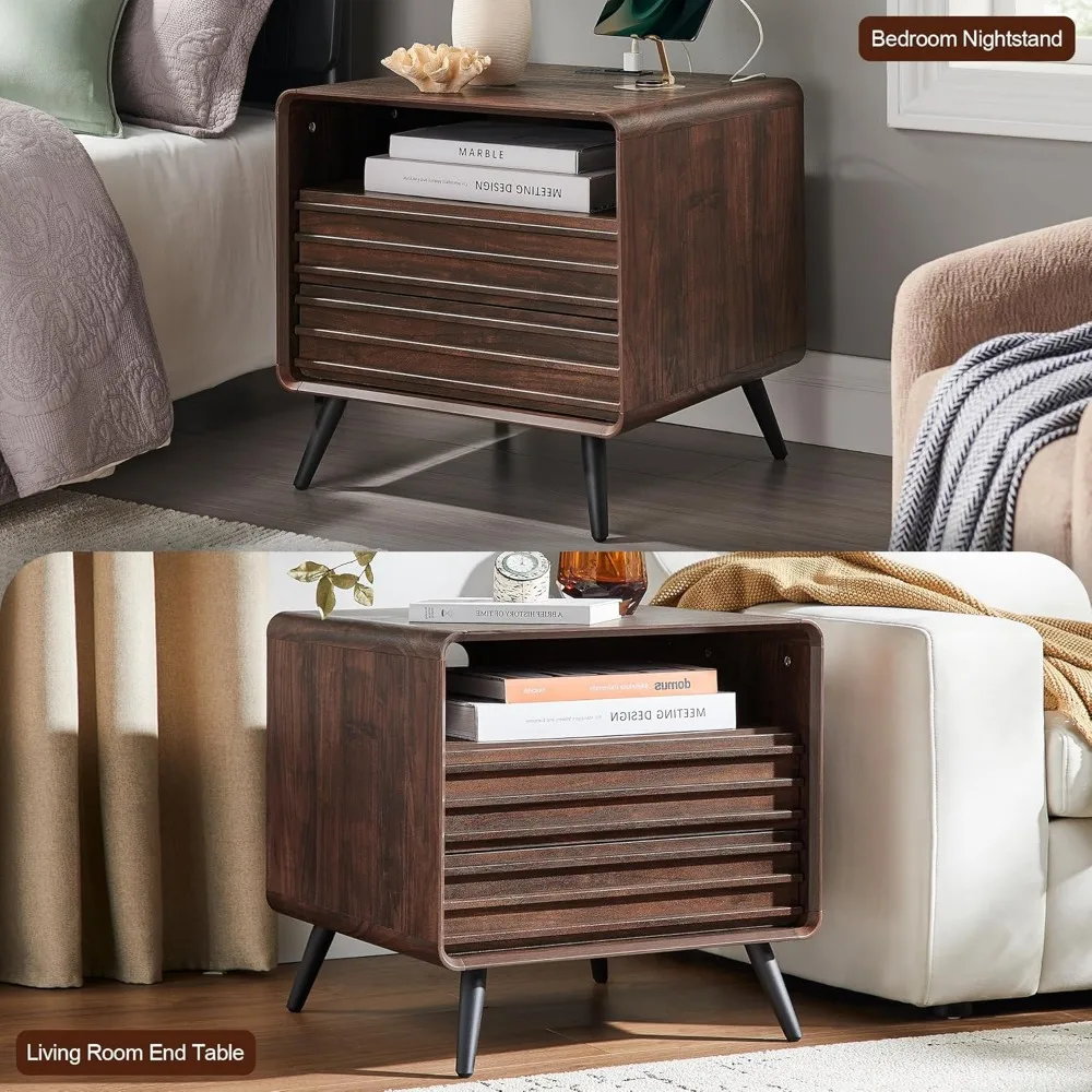 - Ample storage spaceThe mid century modern nightstand with 2 smooth-glide drawers and a semi-open top cubby featuring a cord cutout, this wood nightstand can be used to store everything such as laptops, books and daily necessities. Whether in your bedroom or living room, it’s a versatile addition that complements your space and offers the functionality you desire. Large cable hole easily tuck power cords and charging cables, keeping them neat and organized.