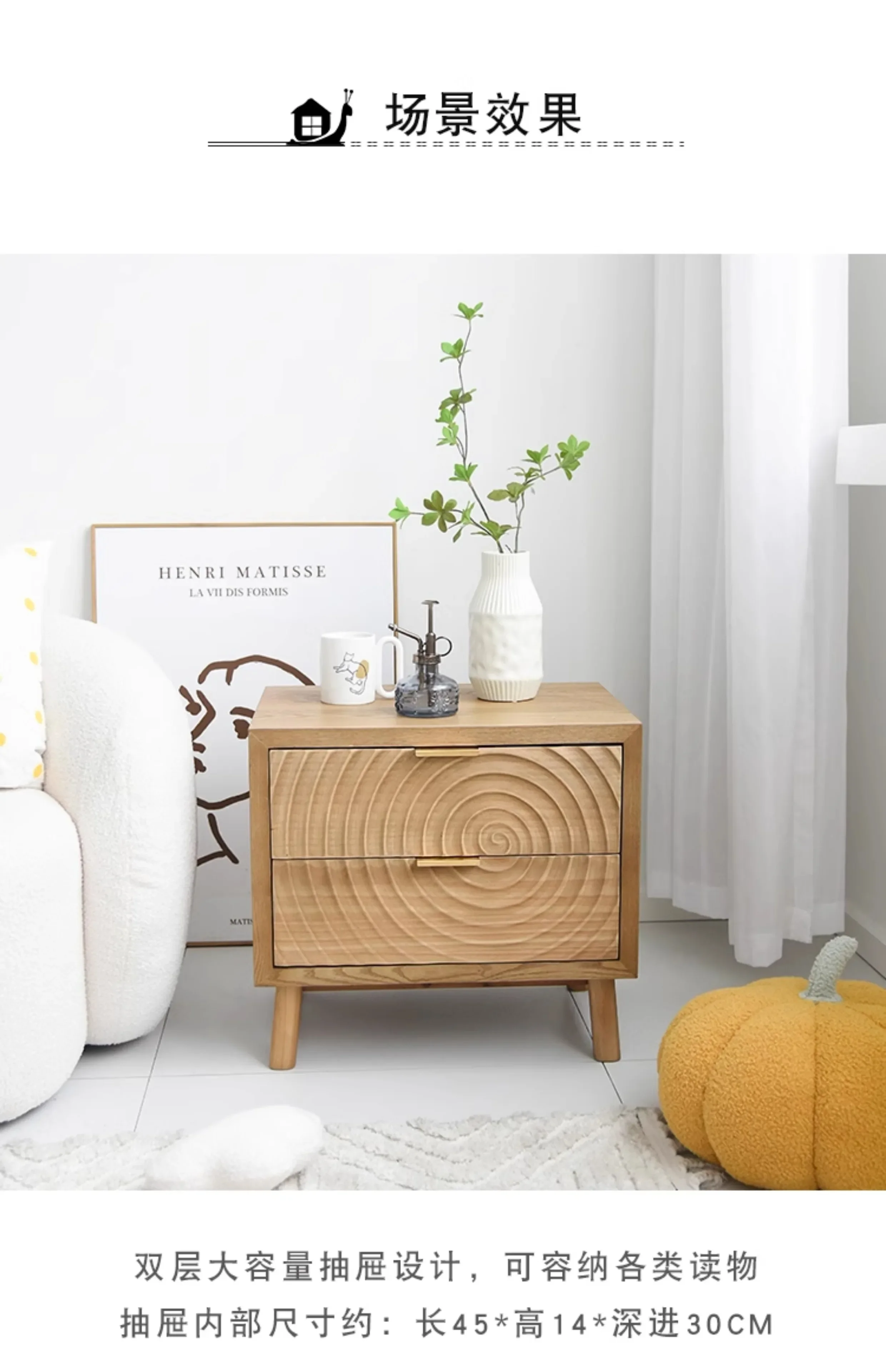 - Function: Bedside table with storage drawers